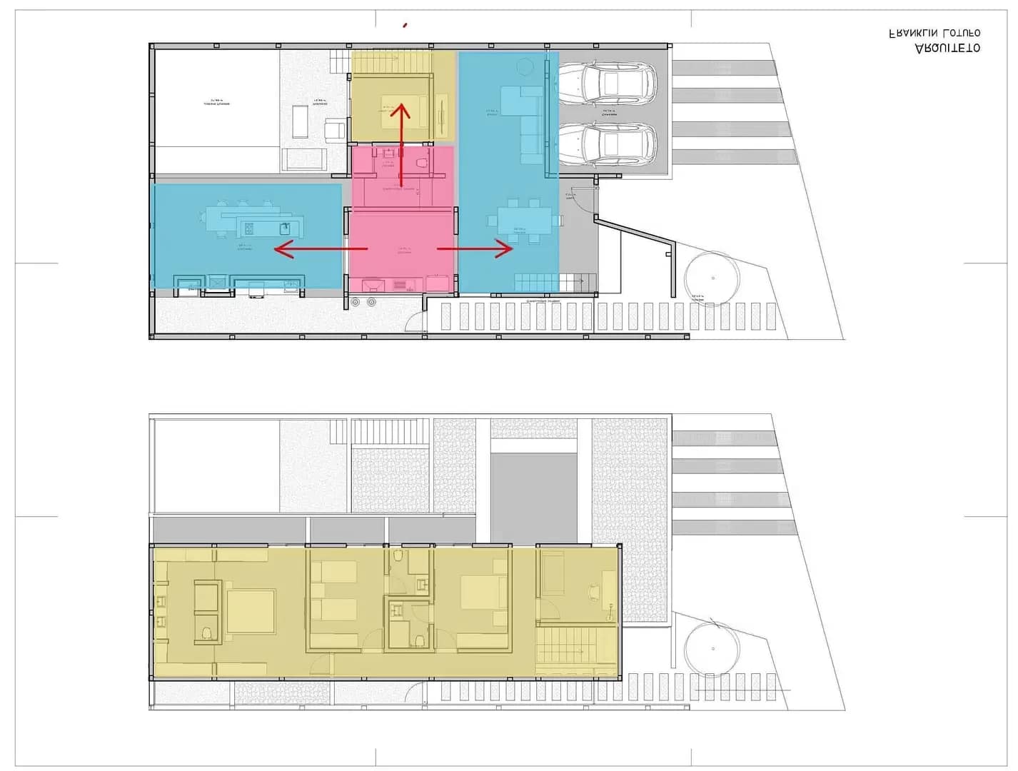 #6 – D.C. – Neste sobrado, por uma exigência também do cliente, é a cozinha o centro gerador. A distribuição se faz agora em três direções, servindo as salas, o gourmet e o quarto no nível térreo. No segundo andar, um volume puro “apoia-se” nesse centro, nele encontra-se os espaços privativos (quartos) e um home Office. O terraço, a piscina e o lazer complementam o programa.